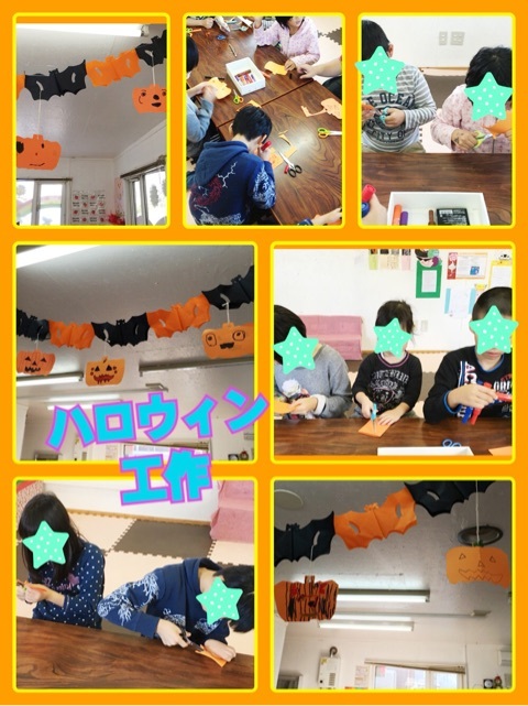 色紙をカボチャの形に切った後は、好きな表情を書いて~