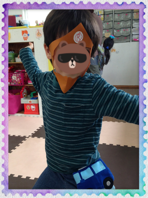 切り紙遊びが最近のブームの男の子。イニシャル入りのお面をつくって、決めポーズ