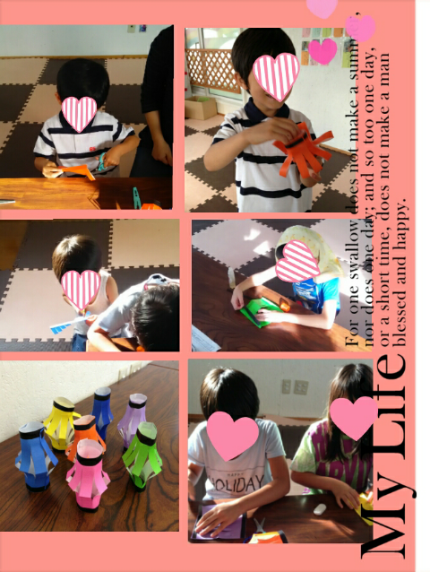 今日は、課題のあと、お祭りにむけ、室内を装飾しようと、『ちょうちん作り』をしました