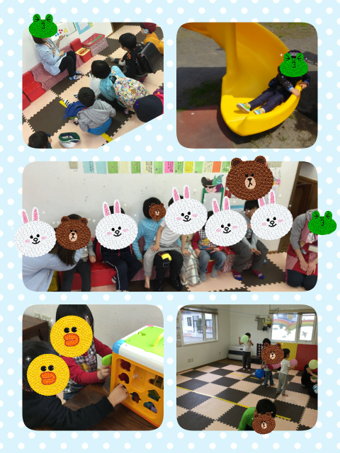 午後~型はめあそび、風船遊びに、リズム活動。雨がぱらついて外に出られなくても室内で体を動かし、熱気ムンムン