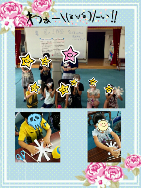 今日は、工作会とのことで、紙コップやストローを使い、くるくる回るオモチャ、『くるくるフラワー』を作りました